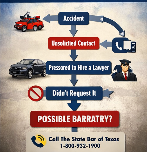 If you have been in a car accident in Texas, you may have experienced something unsettling: an unexpected phone call from someone claiming to be a lawyer or a legal representative, or an out-of-the-blue text message or a stranger showing up at your door, urging you to hire a specific attorney or provide “injury assistance”. You may have wondered whether that was normal — or even legal. The answer, in most cases, is NO. What you likely experienced is a practice known as barratry, and in Texas, it is a crime.